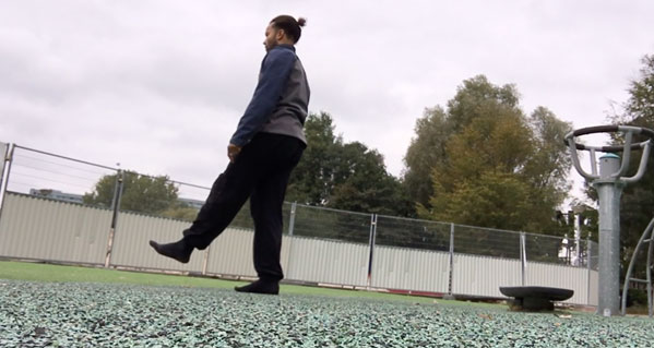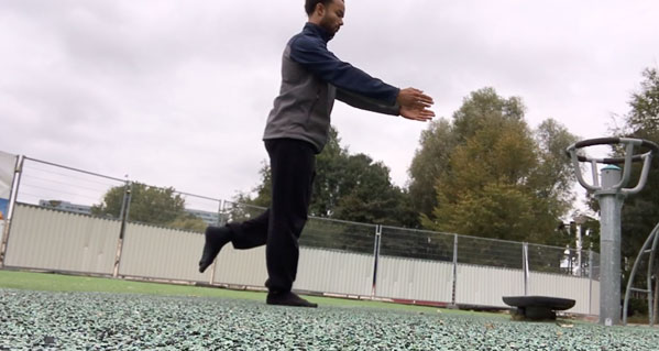 2) Shift your weight to 1 leg until you reach about a 90 degree angle with your knee.
